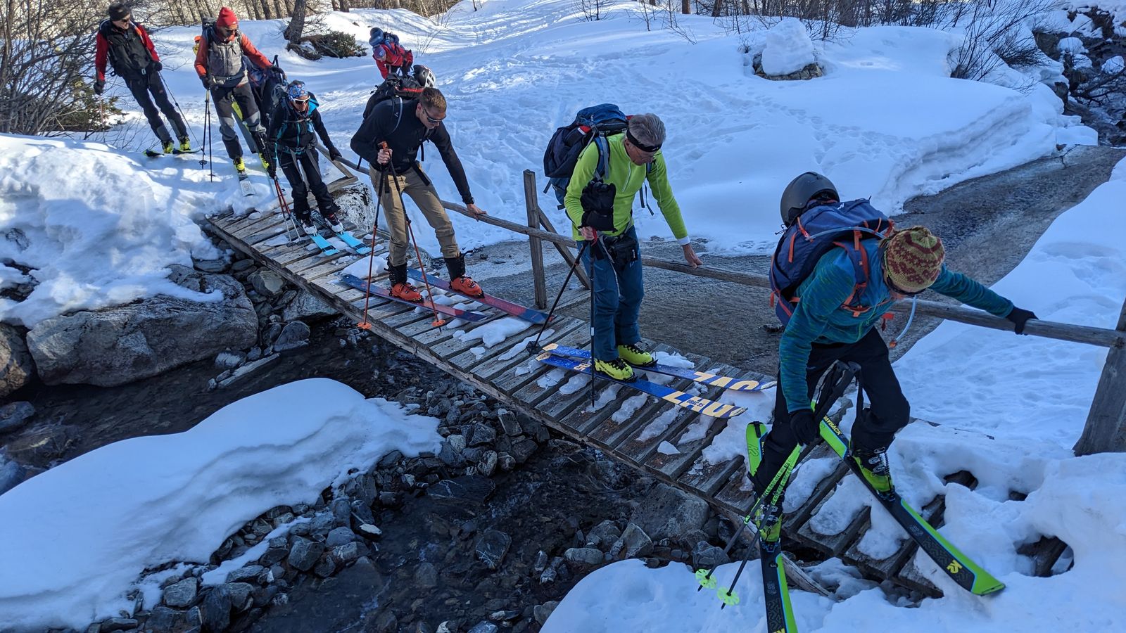 La première descente se fait dans de la neige de printemps, ramollie à point par la chaleur et le soleil. Ça tourne sans difficultés et sans pièges.